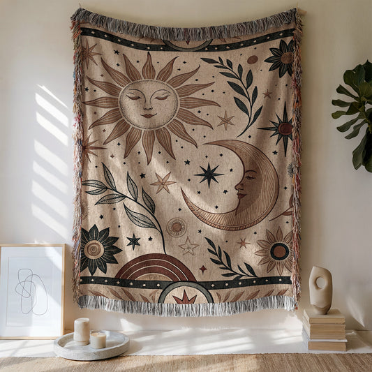 Celestial Sun Moon Star Design Cozy Boho Woven Blanket