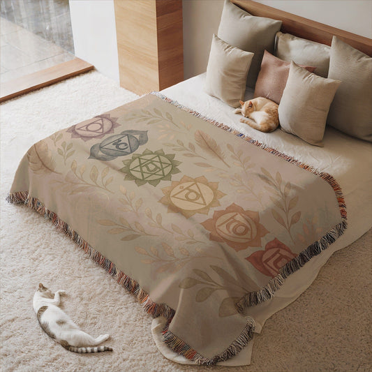 Chakras With Leaves And Feathers Yoga Style WOVEN BLANKET